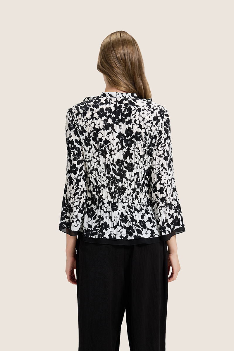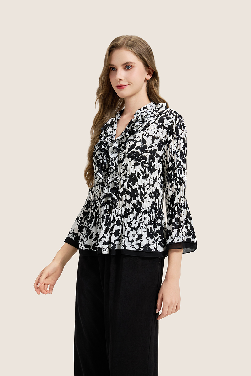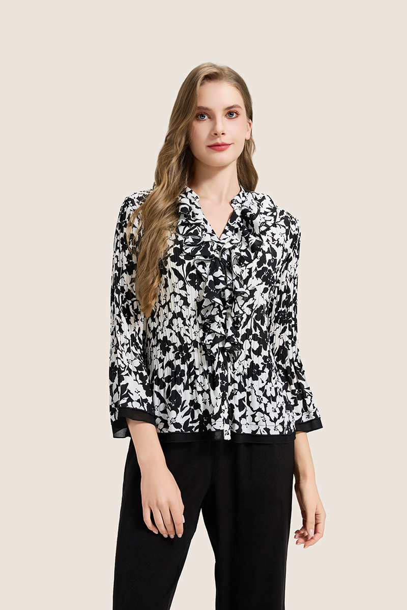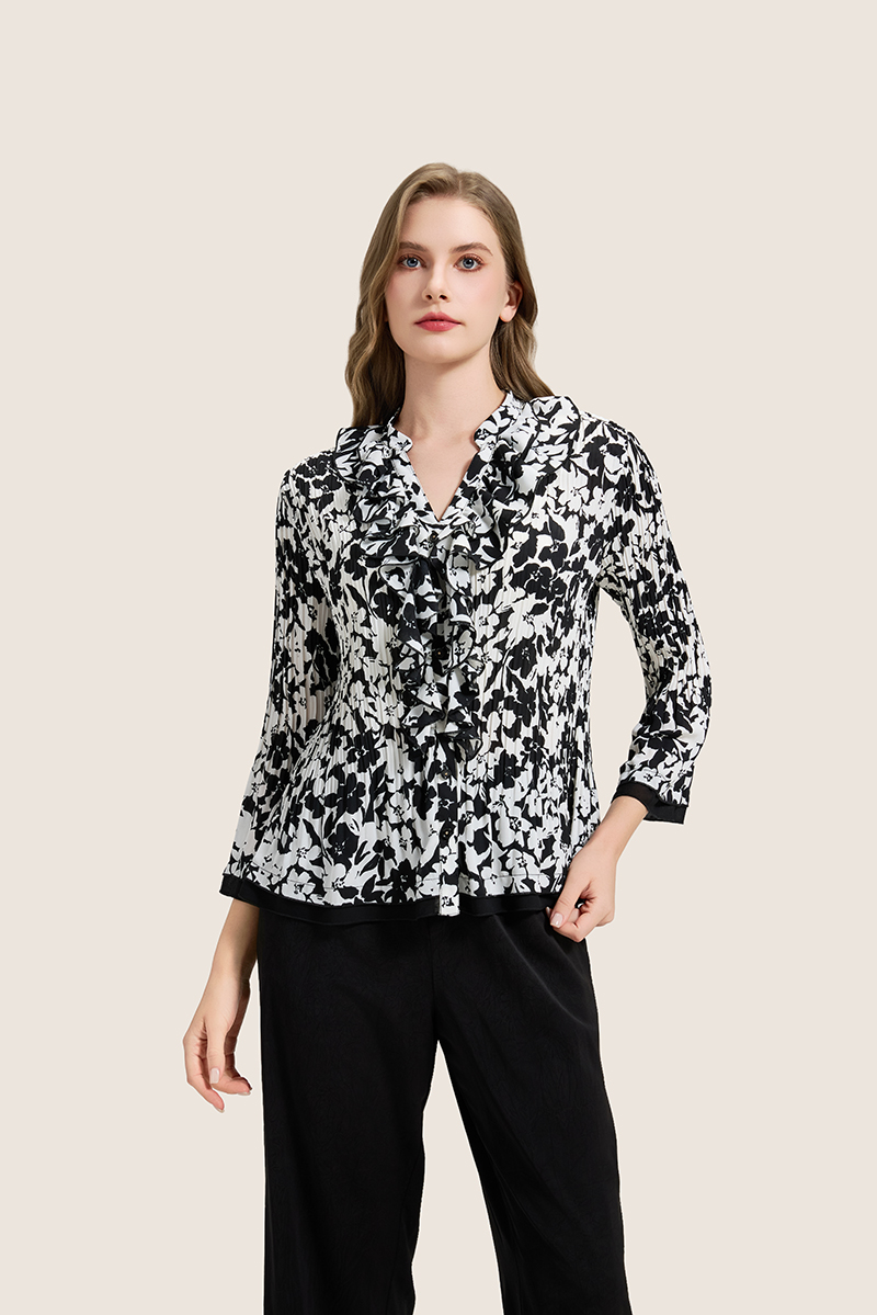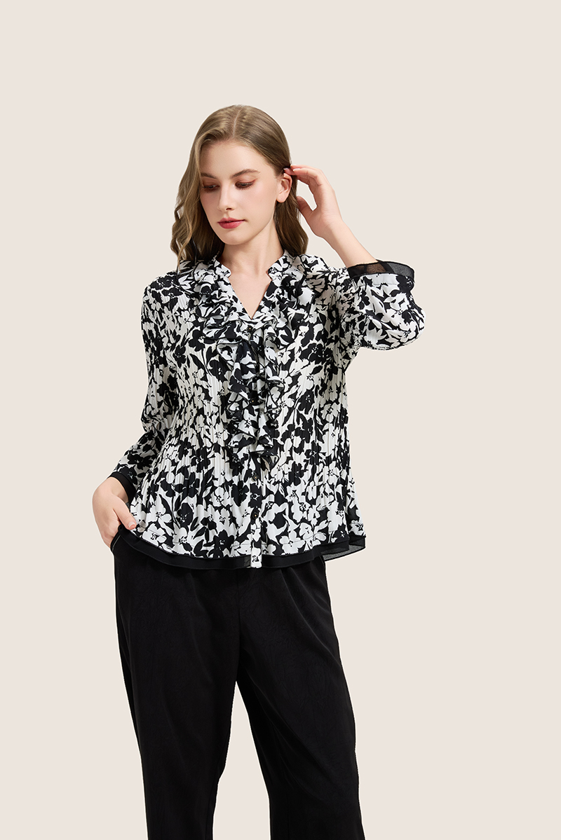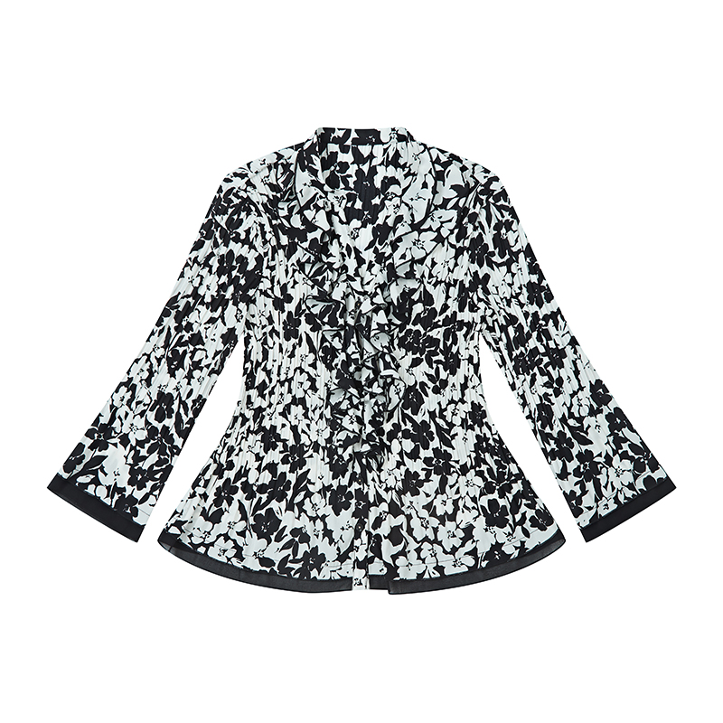 Beschreibung: Bedruckte Blusen aus weichem Recycling-Georgette mit schönen Volants verlaufen entlang der Knopfleiste in der Mitte, die Falten lassen Sie schlank und elegant wirken.